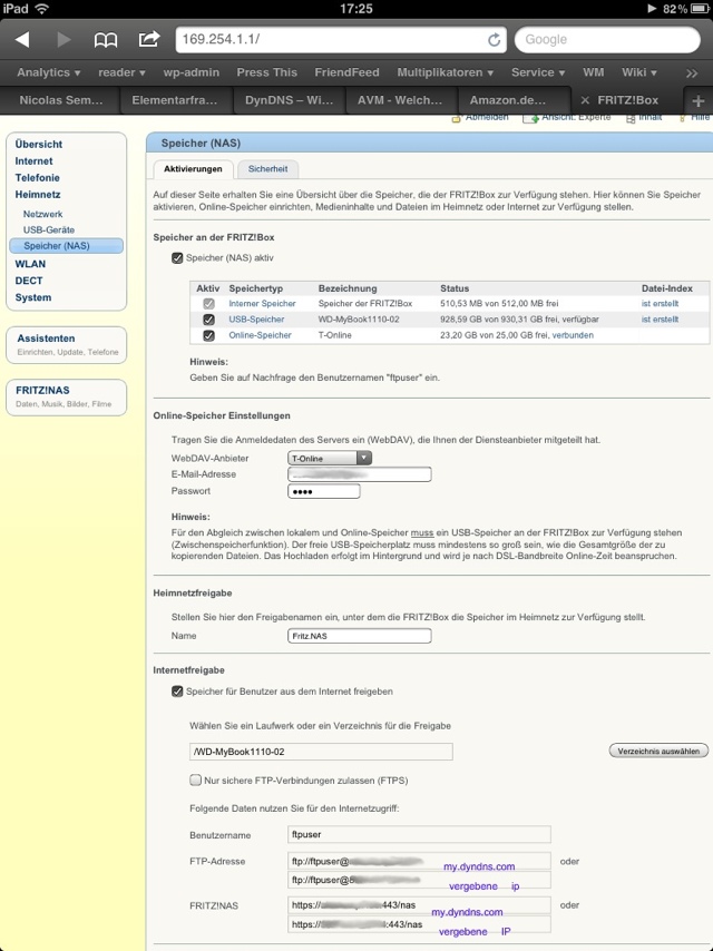 So zurück zur FritzBox 7390 bei Amazon und den Zusatzfunktionen die ich kennengelernt habe: Fritz.Nas sehr cool eine USB Festplatte an die Fritzbox und man hat recht einfach einen Medienserver bzw. einen Datenspeicher im heimischen Netzwerk den man auch für das Internet Freigeben kann. Wenn Dein Provider Dich einmal am Tag ab- und anmeldet, dann benötigst Du eine Dynamische DNS. Dieser Service erkennt durch die Anmeldung deine IP und gibt diese an den anfragenden weiter. Danach wird das NAS eingerichtet: Auch neu ist, dass Du einen Onlinespeicher deiner Wahl, T-Online, GMX bzw. 1und1 Mediencenter oder Box.net einrichten kannst. Es muss sich dabei nur um einen Web-DAV Service handeln. In das Verzeichnis schmeißt man seine Daten und schwups die Fritzbox kümmert sich um den Upload. Als nächstes richtet man Good Reader auf dem iPad oder Good Reader iPhone ein. Hier eine Beschreibung wie man die iPhone App. einrichtet.