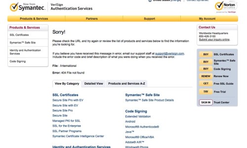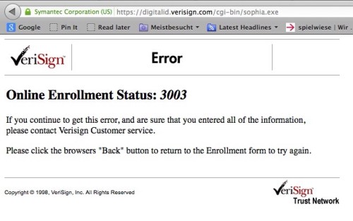 Update 2 So jetzt habe ich die Nase voll und Wechsel, nach einem freundlichen Hinweis von M, zu StartSSL das meint Fefe und Heise ist positiver. Der Erwerb, die Installation ist sowas von einfach, dass Ihr es probieren müsst. Update Also der Support von Verisign bzw. Symantec hat sich nicht gemeldet. Aber die Seite http://www.symantec.com/verisign/digital-id wurde am 3.11.2012 überarbeitet und man kann wieder Digital ID´s kaufen. Etwas seltsam ist, dass ich eine sophia.exe bekomm mit der ich als Mac User nichts anfangen kann. Na mal sehen wie das jetzt funktioniert. Vor einem Jahr habe ich die Email Zertifikat von Verisign für 20 $ geshoppt. Ich kann mich grau daran erinnern, dass es irgendwie im hintersten Winkel der Website versteckt und der Abschluss nicht wirklich einfach war. Heute kommt eine Erinnerungsmail das der Service verlängert werden soll. Okay dann drücke ich halt den Link hab ja heut eh nichts besseres zu tun und schon fängt das Ärgernis an. Erster Link https://digitalid.verisign.com/services/client/renew.htm Man sucht seine ID, gibt seine Kreditkartendaten ein und akzeptiert die AGB´s und landet auf folgender Fehlerseite, das klingt doch vertrauenswürdig.