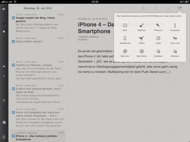 Heute Berichte ich über einen News Reader für iPad und iPhone bzw. IPod Touch. Ja! Reeder kostet Geld und deshalb kann man mehr erwarten als bei kostenlose Apps. Reeder ist stabil, im Gegensatz zu Mobile RSS. Mobile RSS stürzt bei schneller Hantierung gern mal ab, das heißt während dieser sich mit Google synchronisiert und man gleichzeitig im Menu navigiert dann verschluckt sich Mobile RSS gern. Allerdings hat Mobile RSS die Abonier Funktion die vermisse ich bei Reeder wirklich. Aber Reeder ist verflucht schnell, speichert die Artikel und man kann On- und Offline die Artikel lesen. Die Übersicht der einzelnen Feeds wird in "Stapeln" angezeigt. Die gewohnte Ordner Struktur wird angenehmer Visualisiert. Nach einer kurzen Eingewöhnungszeit kommt man mit den gewohnten Fingergesten super zurecht. Mit Zwicken von Daumen und Zeigefinger navigiert man in den Ordnern und kommt auch so wieder in die Übersicht. Das blättern durch die Artikel ist sehr angenehm und funktioniert auch besser als bei Mobile RSS. Ich freue mich dass ich die knappen vier Euro investiert habe. Damit ich meine Freunde und Bekannten über lesenswerte Artikel informiert kann, gibt es eine Menge an Sharing Möglichkeiten. Email, Twitter und vieles mehr...Was mich aber zu diesem Artikel bewogen hat ist die extrem ansprechende und gute Integration des Webbrowsers. Bei Mobile RSS habe ich noch nie Kommentare zu Artikeln geschrieben, ich bin immer dafür in den Safari gewechselt. Heute habe ich gleich einen Kommentar gepostet. Reeder ist derzeit mein Favorit! http://itunes.apple.com/de/app/reeder/id325502379?mt=8 Verfasst und Screenshots mit Wordpress App. auf einem iPad.